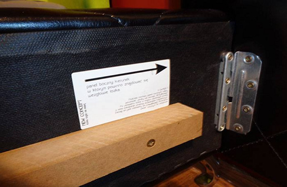 Po ustawieniu łóżka w miejsce docelowe, dokręcamy mocno, poluzowane wcześniej mocowania w celu prawidłowego dociśnięcia paneli bocznych do wezgłowia. Używamy do tego śrubokręta gwiazdkowego lub wkrętarki z wolnymi obrotami. - Pojemnik na pościel (jeżeli go mamy) montujemy przy pomocy konfirmatów i klucza imbusowego. Boki z czołami skrzyni należy skręcić tak aby miejsca przygotowane do przybicia płyty HDF były usytuowane na górze. Na tak przygotowany szkielet należy położyć arkusze płyty i przybić za pomocą załączonych gwoździków.