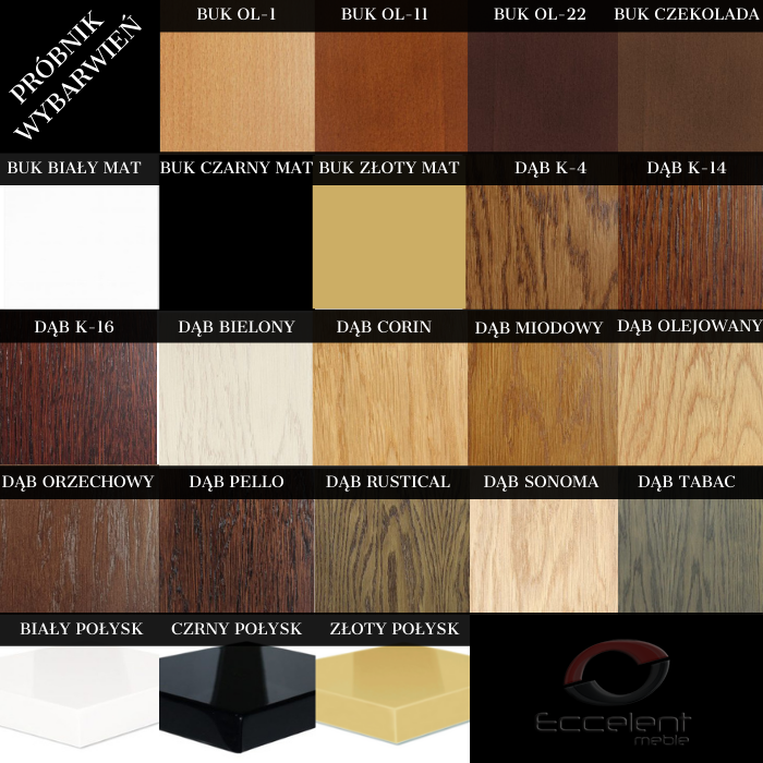 - Nogi: wybarwienia bukowe, dębowe, biały mat, czarny mat, biały połysk, czarny połysk, złoty mat, złoty połysk