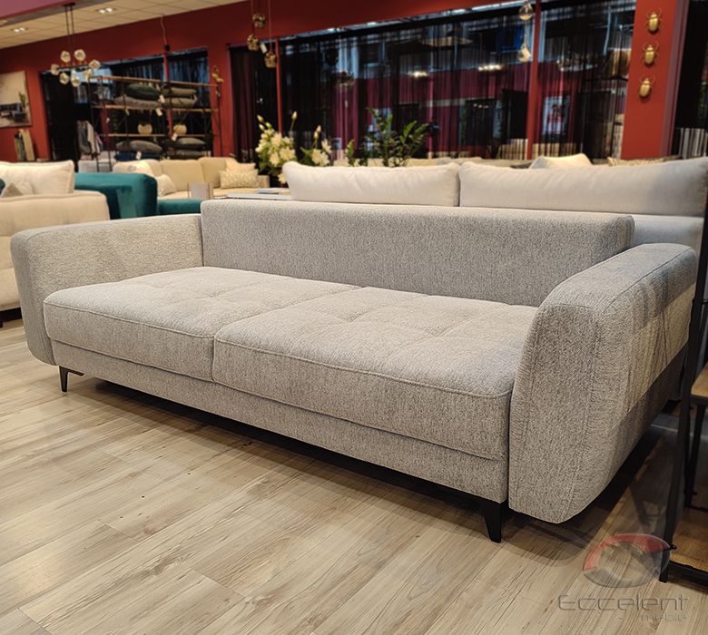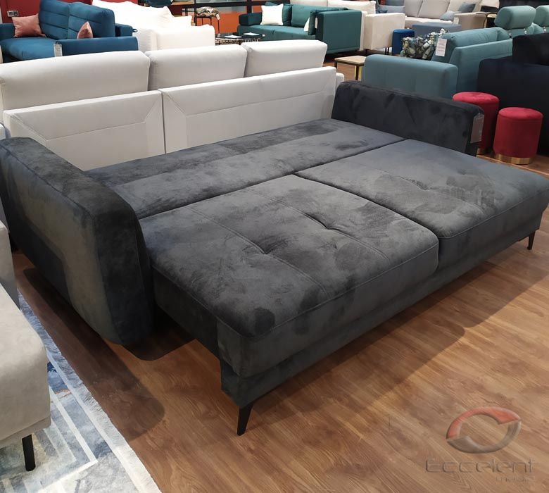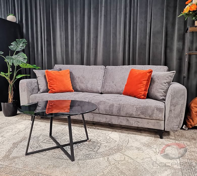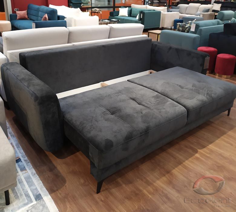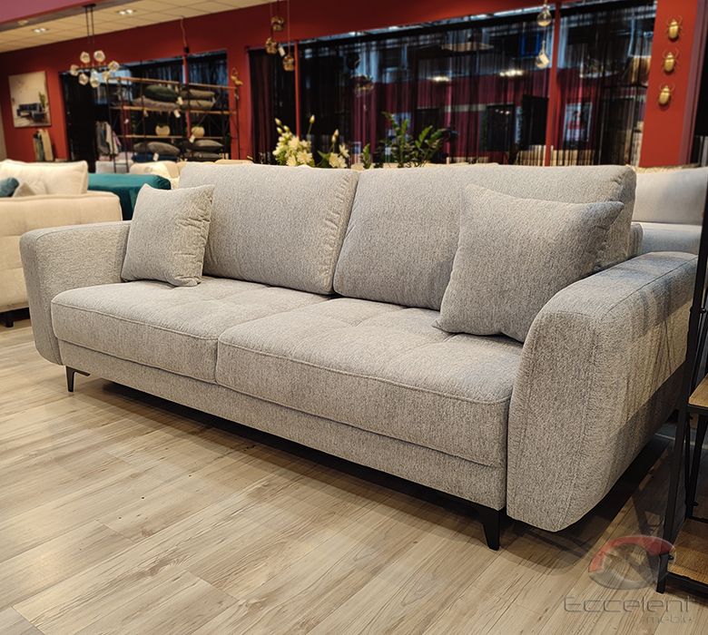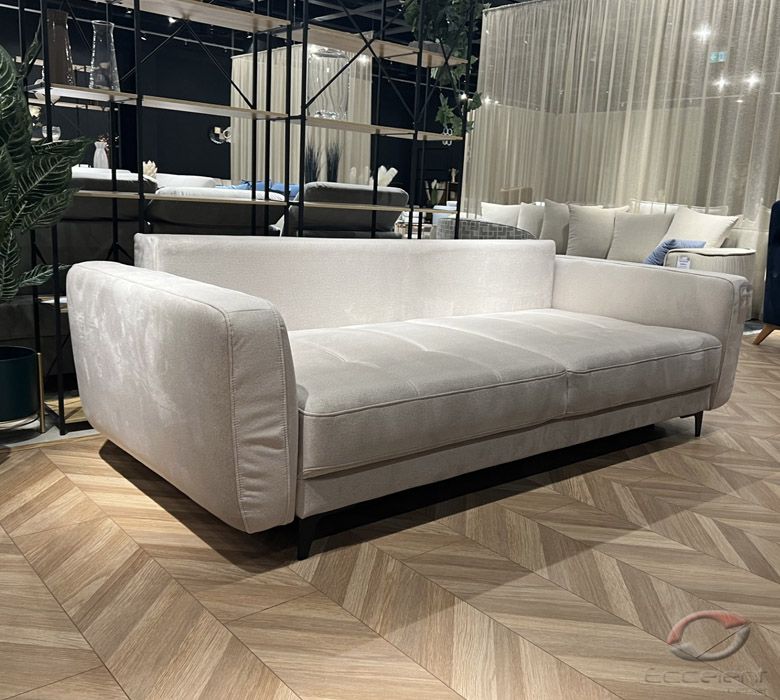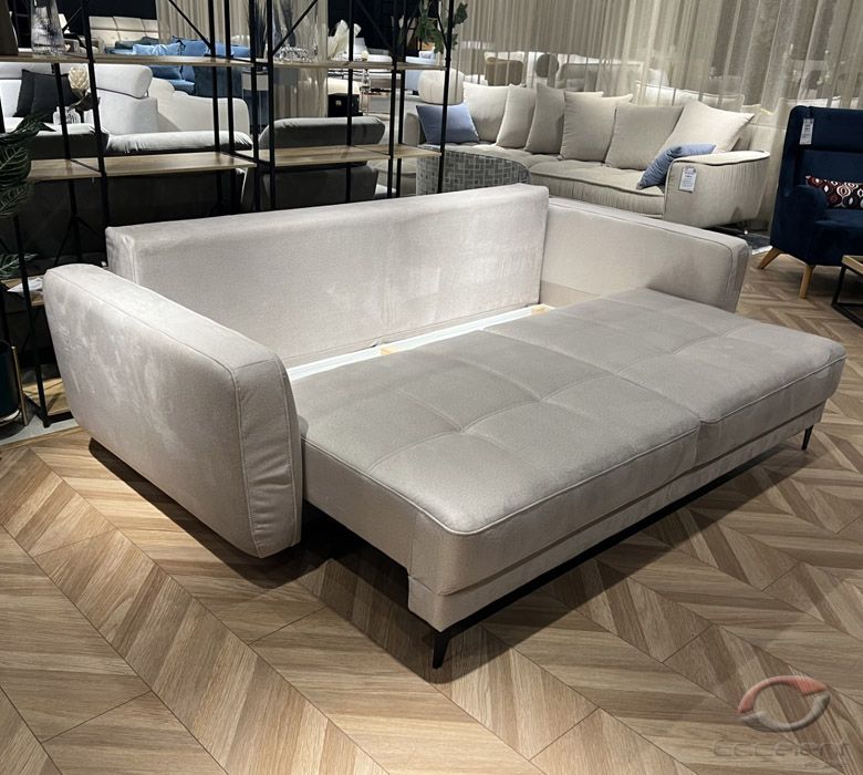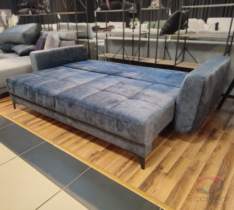 Przeszycia na siedziskach dodają sofie wdzięku i oryginalności. Duża powierzchnia spania oraz pojemnik na pościel