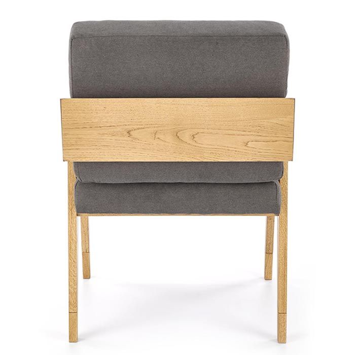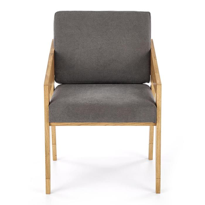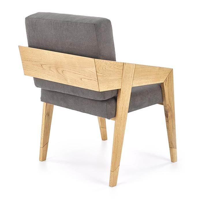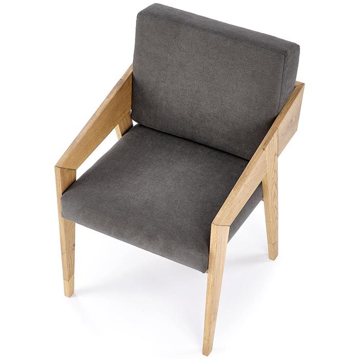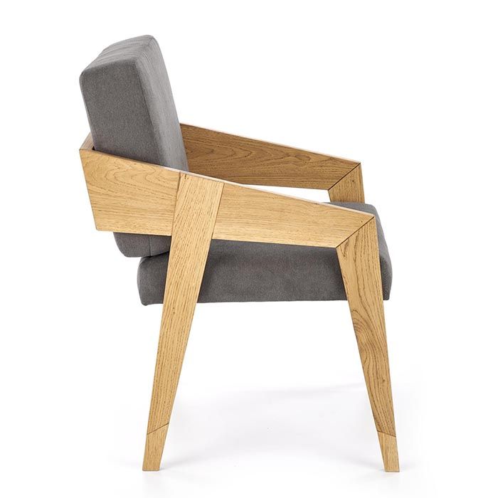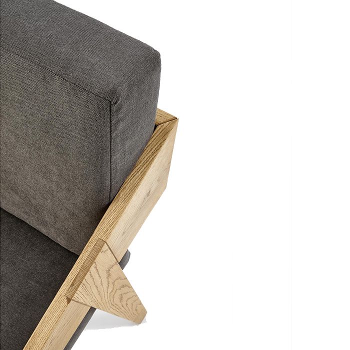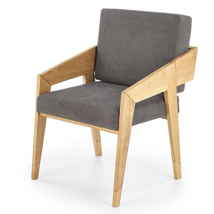 Wykonany z litego drewna dębowego, ma kwadratowe siedzisko i oparcie z poduszką w szarym kolorze.
