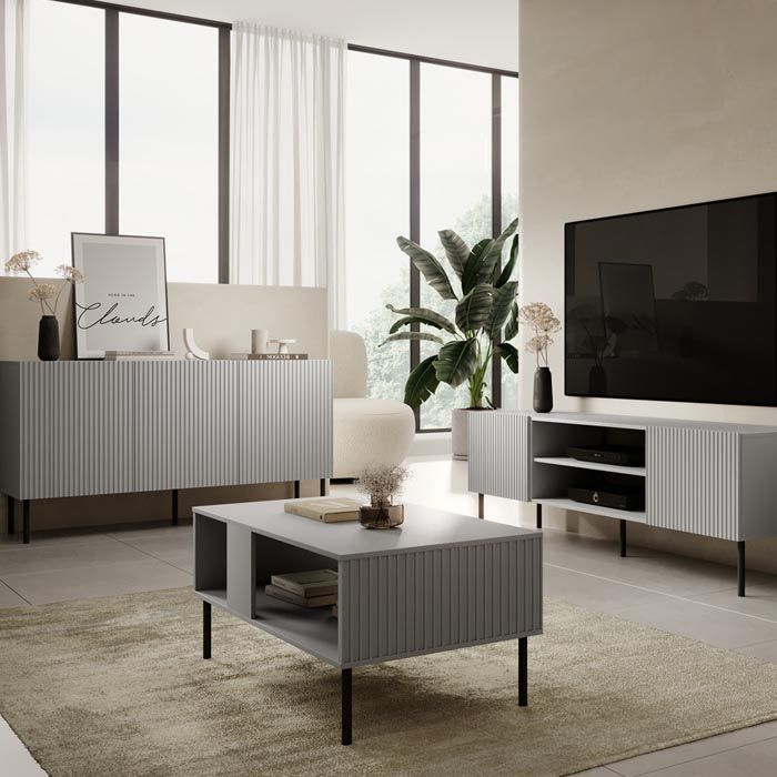 Dzięki ryflowanym frontom mebel ten nabiera nietuzinkowego i oryginalnego wyglądu.