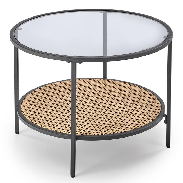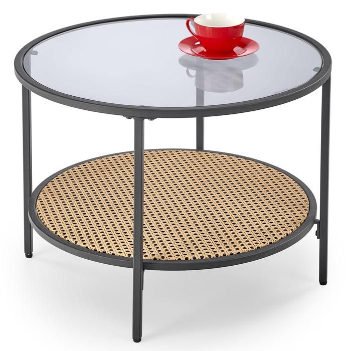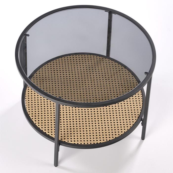 Cienkie stalowe nogi i transparentna szyba nadają lekkości i klasy, a charakteru dodaje podstawa z rattanu w