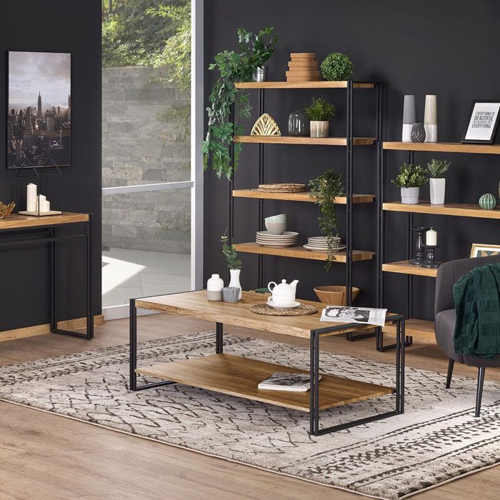 Kolekcja BOLIVAR oferuje kilka kombinacji regałów, konsolki oraz stoły z krzesłami.