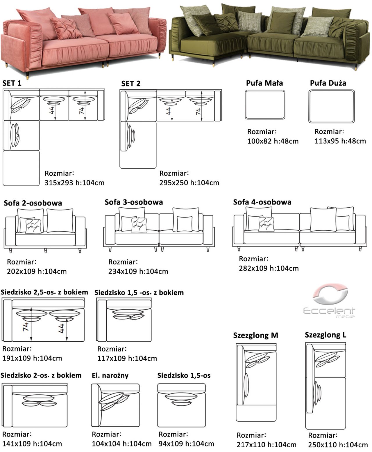 - narożnik składa się z segmentów: puf duży + sofa 1,5 osobowa + element narożny + sofa 1,5 osobowa + sofa 1,5 osobowa z bokiem