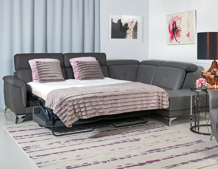 dłuższą żywotność (sprężystość) siedziska. Narożnik posiada funkcję spania w postaci wygodnego stelaża włoskiego. Na uwagę zasługują
