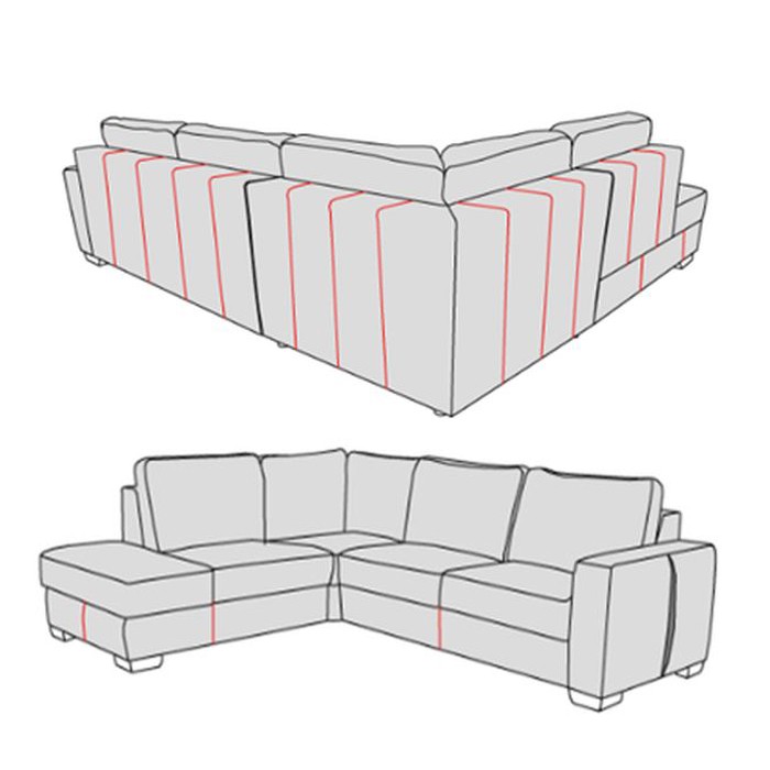 - w obiciu ze skóry naturalnej występują dodatkowe łączenia (na zdjęciach rozkroju oznaczone czerwonym kolorem)