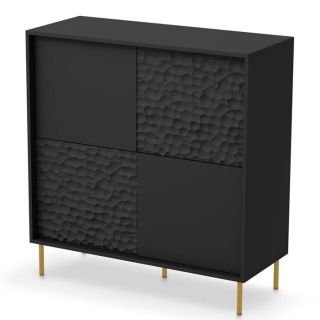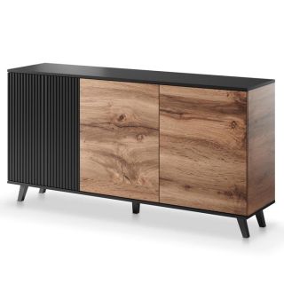 Połączenie frontów czarny mat i orzechu ze strukturą 3D nadaje meblu oryginalnego wyglądu.