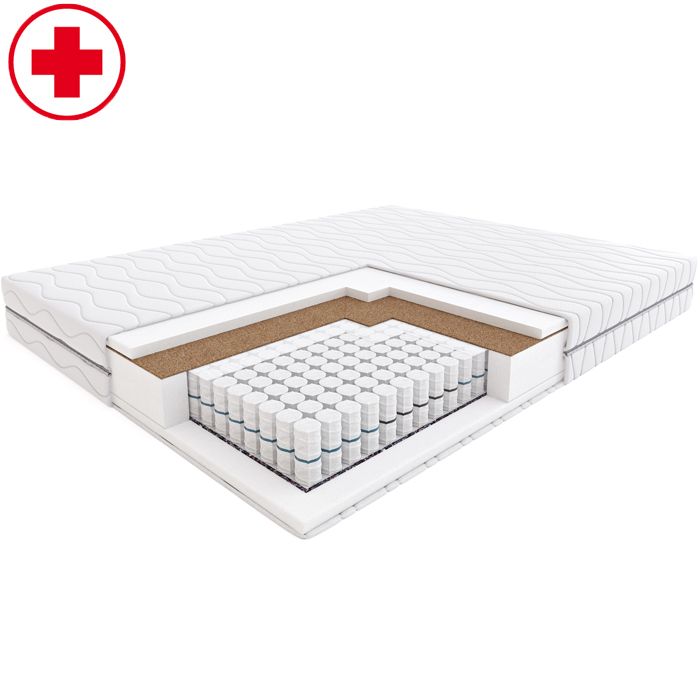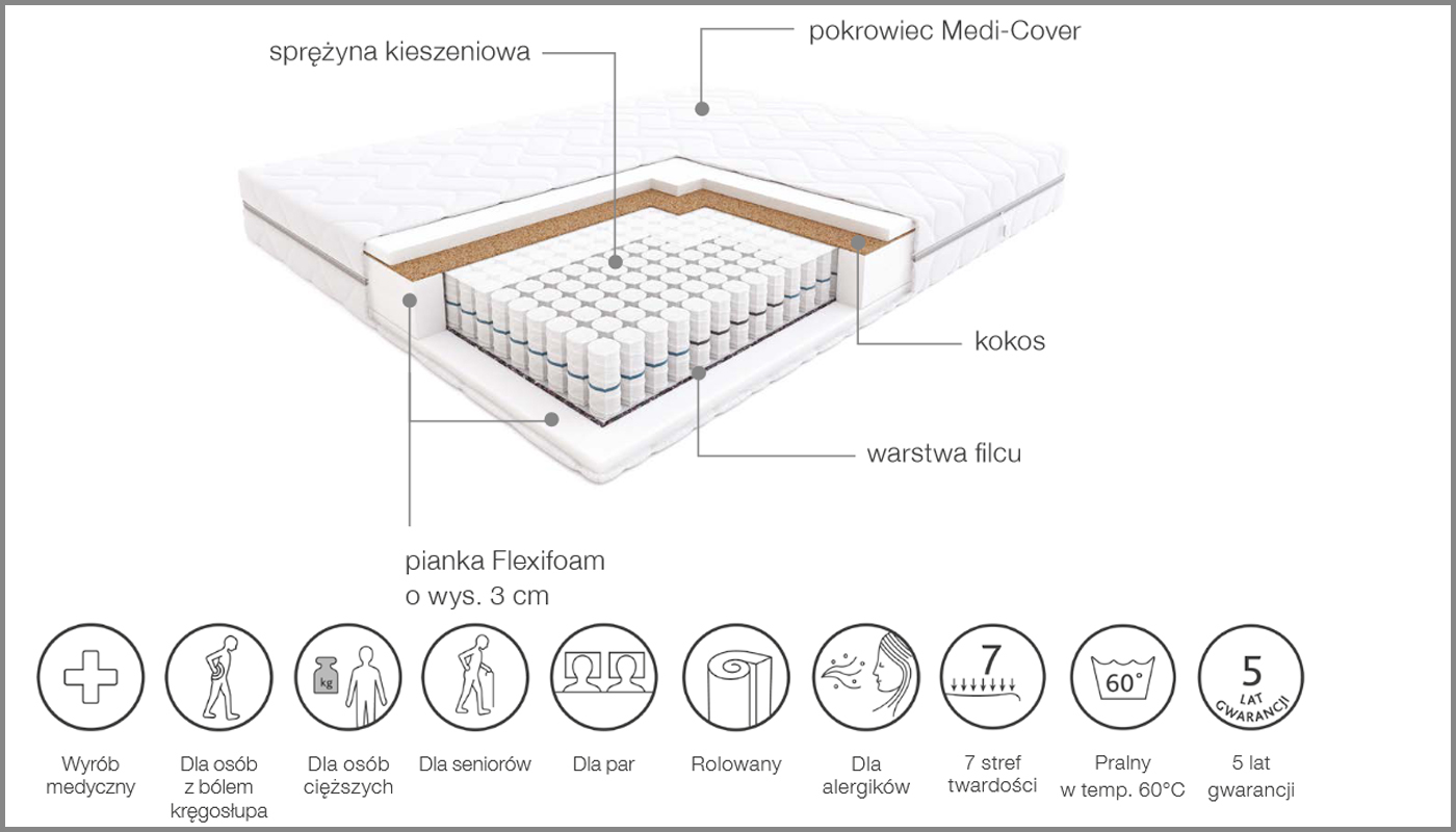 Materac skonstruowany na bazie sprężyny kieszeniowej o 7 strefach twardości, dodatkowo utwardzony warstwą płyty kokosowej