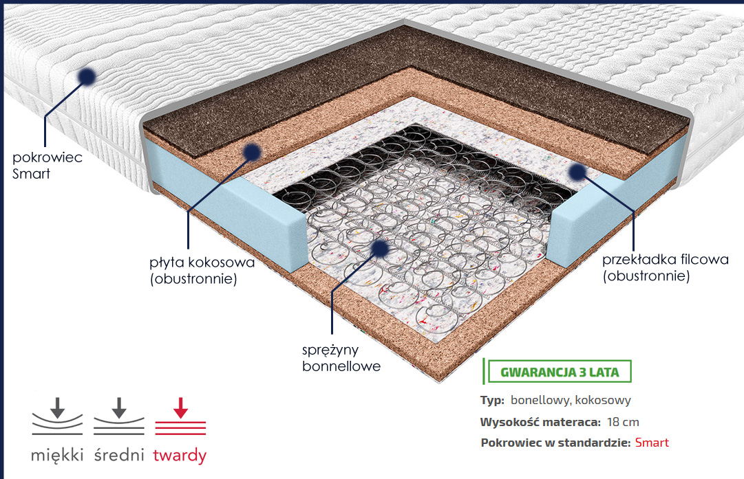 Materac o wkładzie sprężynowo-kokosowym. Sprężyny typu bonell, obłożone obustronnie płytą kokosową