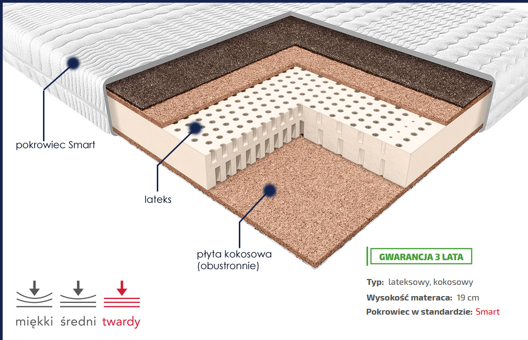 Materac o wypełnieniu lateksowo-kokosowy. Wkład lateksowy o grubości 12 cm jest obłożony obustronnie płytą